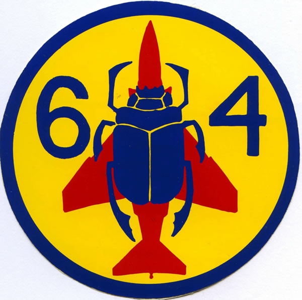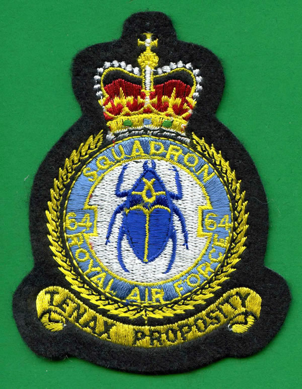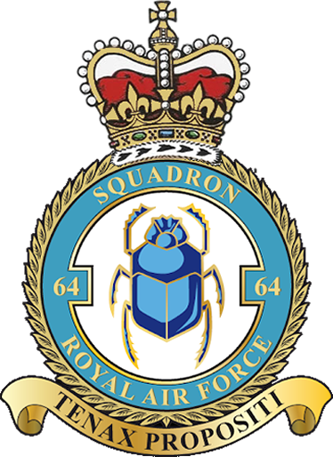 On 1 March 1936, No. 64 reformed at Heliopolis, although for political reasons it was announced as having formed at henlow. Its Demons had already been sent out to Egypt where they formed D Flights in 6 and 208 squadrons which were transferred during March to 64 squadron. With the Abyssinian crisis still on, the squadron's duties were to carry out attacks on enemy airfields and act as cover for bombers being refuelled at advance landing grounds. In August 1936, the squadron embarked for the UK to form part of the fighter defences of London. In February 1938, Demons with turrets were received and by the end of the year these had been replaced by Blenheim fighters at Church Fenton. On the outbreak of war, the squadron was engaged in patrols off the East Coast and in December 1939 provided fighter defence for the Home Fleet from Evanton for a month. In April 1940, conversion to Spitfires took place in time for the squadron to help cover the evacuation from Dunkirk and later to take part in the Battle of Britain. In May 1941, No. 64 Squadron moved up to Scotland for air defence duties but moved back south in November to take part in sweeps over northern France, until March 1943 when it moved back up to Scotland again. Then in August 1943 it moved back south again to resume offensive operations and in June 1944, moved to Cornwall for 2 months before beginning long-range escort missions from East Anglia. In November 1944 the Squadron received Mustangs and flew these for the rest of the war in support of Bomber Command's daylight raids on Germany. In March 1946 No. 64 received Hornet twin-engined fighters and moved to Linton - On - Ouse in August. In March 1951 it converted to Meteors but in August 1956 it began to replace it single-seater fighters with the night-fighter version of the Meteor. In August 1951 the Squadron had moved to Duxford where it remained for 10 years and in September 1958 it became a Javelin Squadron. No. 64 then moved to Singapore in 1964 until it was disbanded on 16 June 1967.
